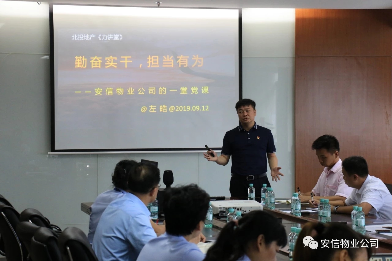 在安信物業(yè)公司黨支部召開“不忘初心 牢記使命”專題組織生活會(huì)上。公司黨委書記、董事長左皓給與會(huì)黨員上了一堂“勤奮實(shí)干、擔(dān)當(dāng)有為”為主題的黨課。