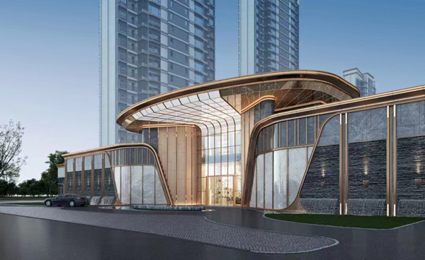 歸家大門采用酒店式環島設計,用11米金屬挑高和10米外延懸挑飄板,建造圓弧造型和星空頂,營造了禮堂級的舒適氛圍。